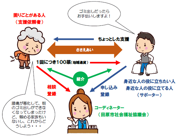 | 「生活ささえあいネット」は、地域での“ちょっとした困りごと”を地域で解決するためのサポートシステムです。 |
