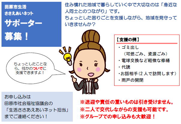 | 田原市社会福祉協議会(田原福祉センター内) 住 所:〒441−3422 田原市赤石二丁目2番地 電 話:0531−23−0610 F A X:0531−23−3970 受付時間:8:30〜17:15 (祝日及び年末年始を除く) ※申し込み、地域通貨の販売は平日のみ 実施主体:田原市(地域福祉課) |
